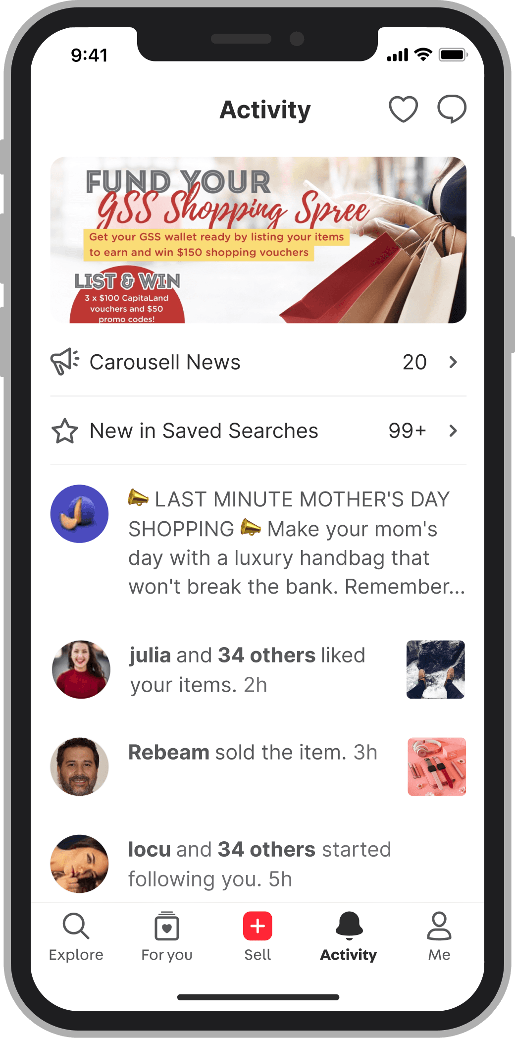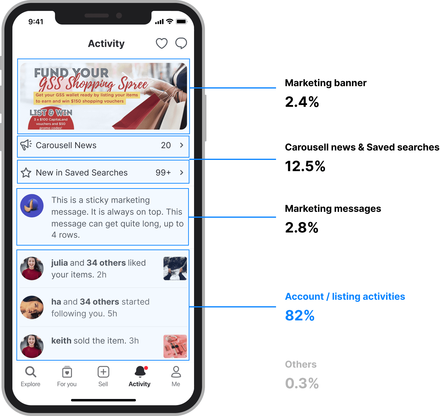 We've found that some content, like marketing banner, Carousell news, and marketing messages has a low CTR but takes up a lot of space. This reduces the visibility of account/listing activities, which have a higher CTR and more relate to users.