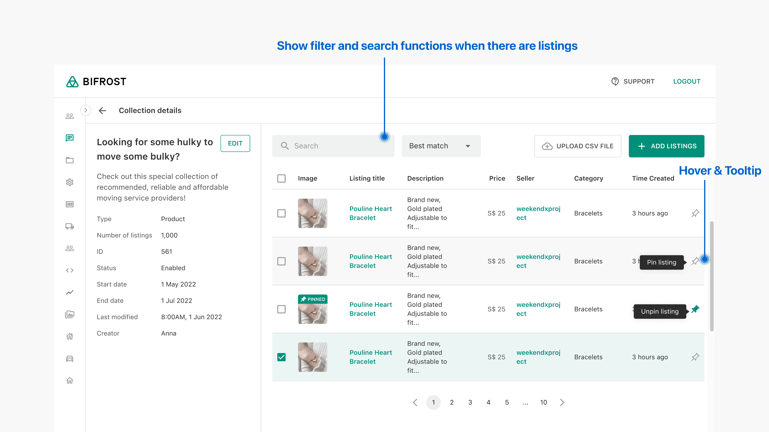 The selected listings appear in the management section, where users can edit or pin/unpin them; pinned items are bumped to the top in the consumer app’s collection, based on marketing team feedback.